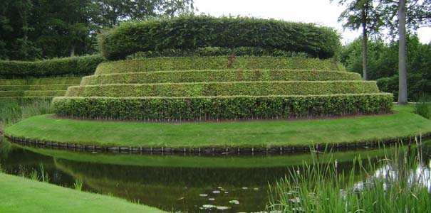 The main feature of this garden is the goose foot pattern of hollow lawn paths and mounded triangular beds of ornamental grasses. The main garden is contained by an elevated walkway with terraced hedges and a moat.